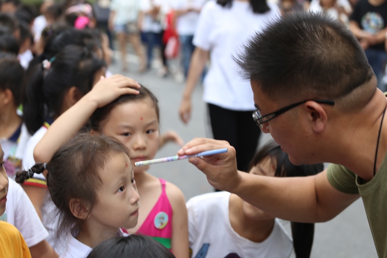 东校区一年级206名学生在老师、家长的引领下踏上红毯,依次走过 “幸福门”“智慧门”“爱国门”。活动中,孩子们佩戴上了城南专属“幸福徽章”,自信地站成东校区新的风景。智慧门前,学校领导和一年级的老师们一道在孩子额间轻点朱砂,为孩子们“启智”,祝愿他们眼明心亮,开蒙启智,立根为学,通晓事理,明志报国。穿过“爱国门”,孩子们在巨幅地图上集结:找一找自己的家乡、说一说自己去过的城市、夸一夸首都北京、唱一唱心中的歌谣。