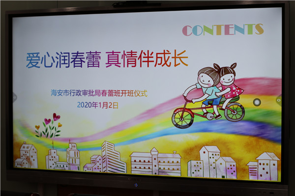 扶一株春蕾,争一片春光,助一名学童,赢一片希望。2020年1月2日下午,海安市“行政审批局春蕾班”开班仪式在城南实验小学西校区举行。行政审批局党组成员、副局长曹青一行,高新区妇联主席张春丽,城南实验小学西校区德育发展处主任顾春芹,海陵中学政教处副主任朱宝银以及城南实验小学和海陵中学的十五位春蕾班学生代表参加了本次活动,活动由顾春芹主任主持。