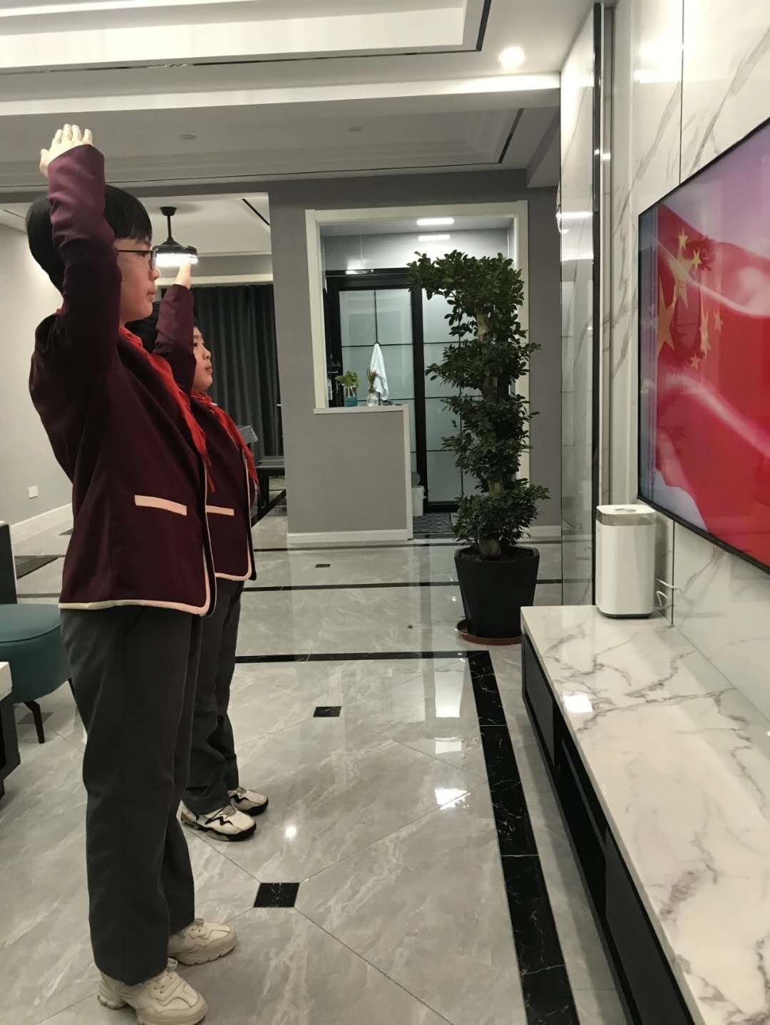 每个星期一的早晨,我们都会准时观看学校精心策划并拍摄的线上升旗仪式。虽然是在家中,但还是要有仪式感,我们穿上整洁的校服,佩戴好鲜艳的红领巾,行队礼,唱起响亮的国歌………