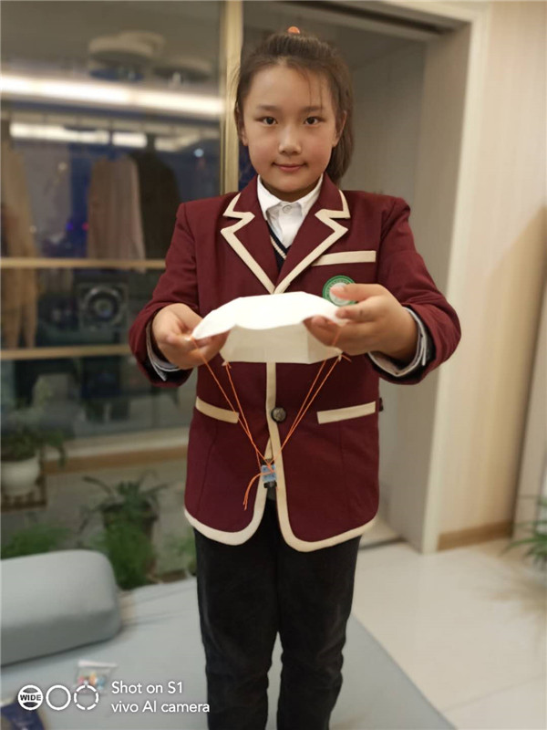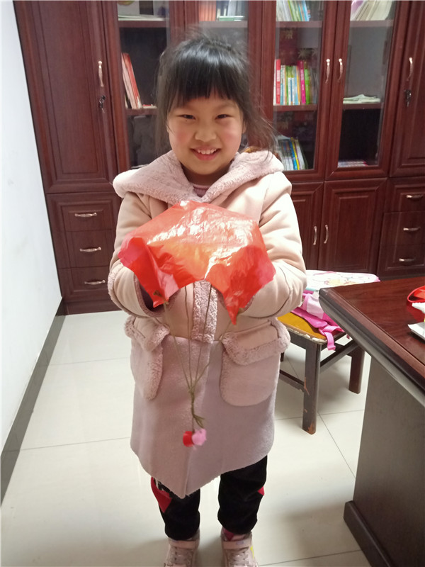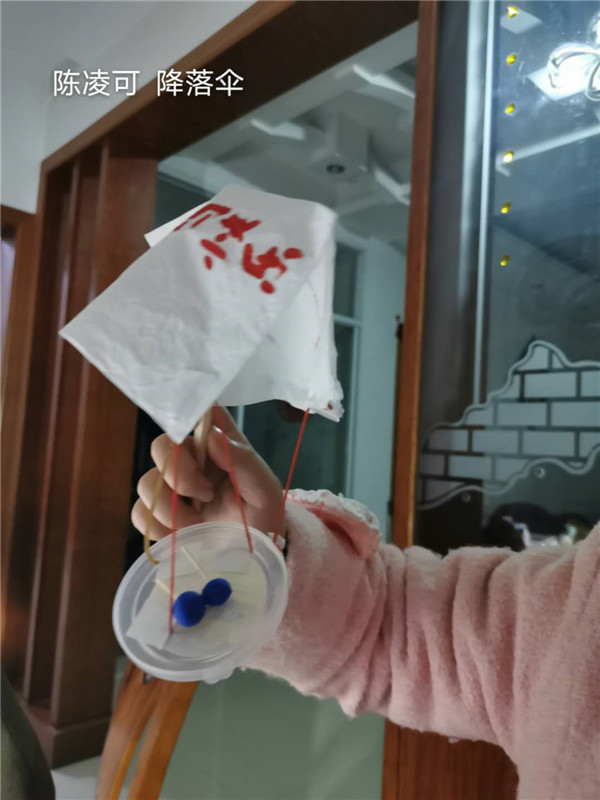 塑料薄膜涂上颜色,系上绳子,制作成了五彩的降落伞。
