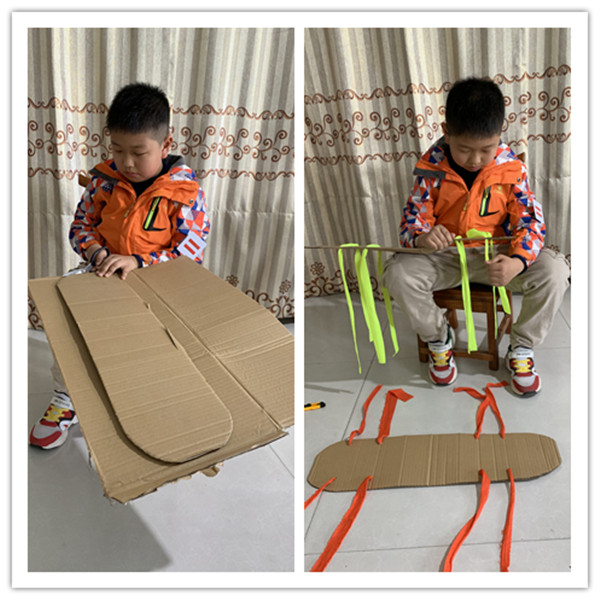 看看家中装璜剩余的地板怎样重新焕发新的生命力?找来宽宽的带子,剪成合适的长条,和爸爸一起钉上钉子。哈哈,稳稳的,牢牢的同心鞋就做好了。把脚伸进去,刚刚好。来,同心协力,我们“一二、一二”喊着号子,穿着同心鞋玩起来。
