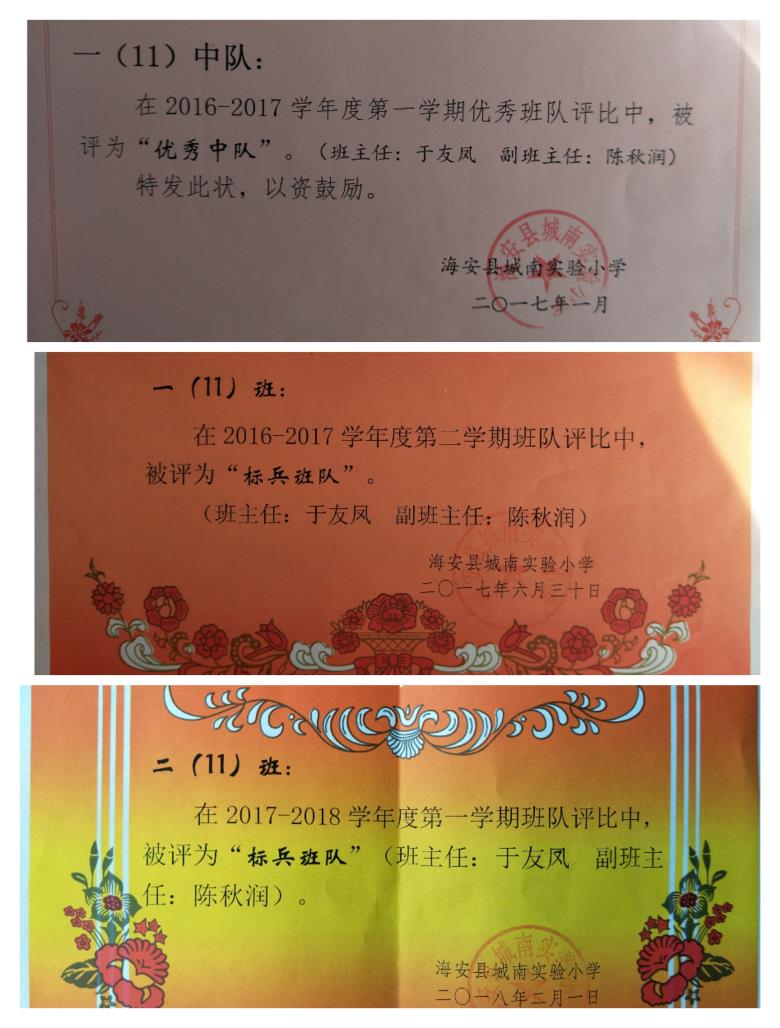 七色花中队的每个成员尽情绽放着自己的绚丽色彩。在县福缘大队张锁妈妈的带领下,中队公益活动丰富多彩,有声有色,孙海辰、崔婧雯等8位孩子获县福缘大队“爱心宝贝”称号;中队获得全国“动感中队”、县“先进学生集体”的称号(图片四);班主任于友凤老师获县“优秀班主任”“优秀党员”、校“最佳教学奖”的荣誉;中队被评为校“标兵班级”“优秀班级”(图片五);孙雲、孙海辰、王沐菡等孩子在省、县报刊上发表文章8篇(图片六);吴晓丽、孙子昂、崔东元、孟莉莉等优秀家长代表为中队的各项活动出谋划策,亲力亲为,着实让人幸福并感动。