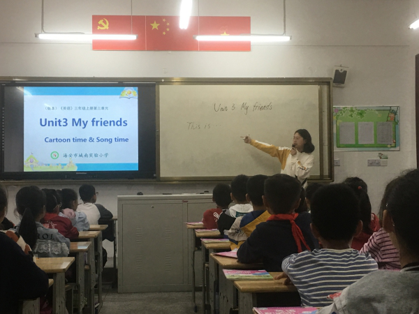 这节课上,首先由介绍三1班的学生作为话题自然引入并复习已学知识,带领学生回顾了Who is he/she? He/She is …这一知识点,然后自然过渡到介绍自己的朋友这个话题,并引出本课重点This is…孩子们热情高涨,纷纷举手发言,争相表现自己。随后,通过三个问题将cartoon time的关键知识点及相关情节梳理清晰,再通过跟读模仿、小组表演等形式进行巩固强化。