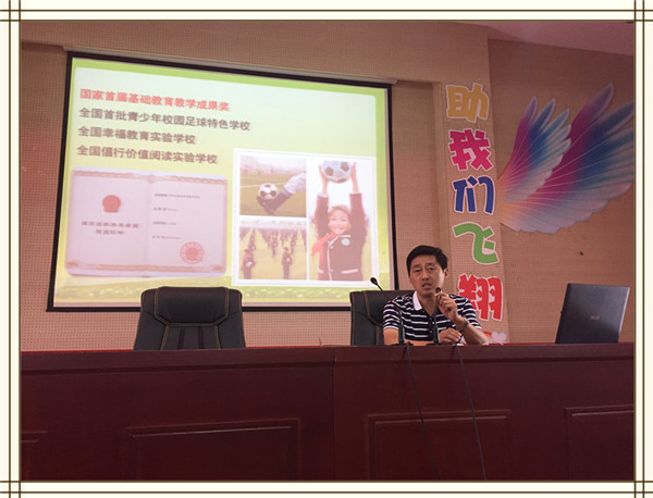 虽然连续进行两场报告,但许校长都非常详细地向家长朋友宣讲了学校幸福教育的内涵,介绍了学校的校训、校徽、校歌、校刊、吉祥物、校服等。会上,许校长非常自豪地介绍了学校办学四年以来所取得的辉煌成就,不管是学生优异成绩的取得、教师团队荣誉的获得,还是学校独具特色的办学成果,成功的背后,最主要的原因是学校幸福教育的办学思想已经成为学校的灵魂。许校长还与家长们分享如何实现幸福教育:要通过“三大领域,四个阶梯”逐步实现,要让孩子们在家里、在学校、在社会感受幸福、理解幸福、传递幸福,创造幸福,最后达到“温暖他人,幸福自己”的境界。