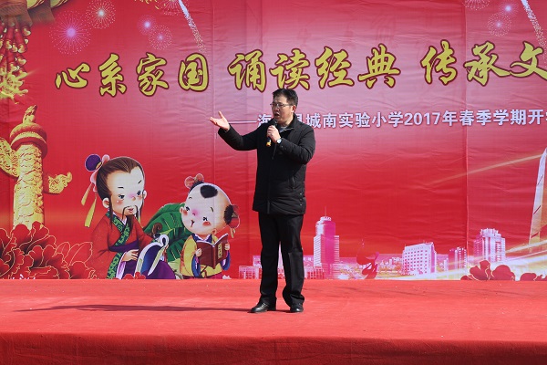 “经典诗文浸润着我们的童年,滋养着我们的灵魂……同学们,今天我们开学第一课的课题是——心系家国,诵读经典,传承文明……”几许鸡鸣声,几许鞭炮声,随着古诗新唱《元日》的音乐响起,海安县城南实验小学2017年春季开学第一课活动拉开了帷幕。