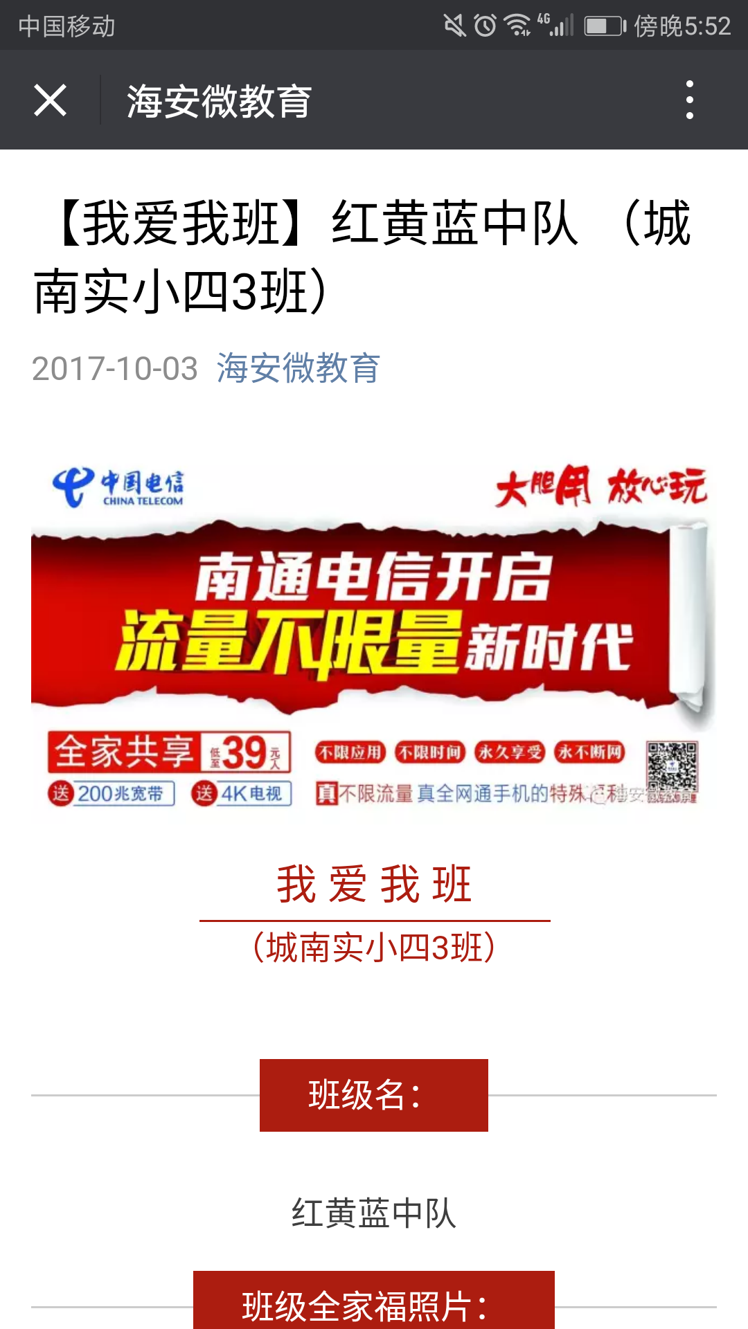 中队的口号是“自由、合作、勇敢、创新”,在开学初期本中队就积极响应省少工委创建“动感中队”的号召,在中队内部开展了丰富多彩的“红领巾小创客——汉字的联想与创造”、“红领巾小书虫——读书漂流”等活动。活动之一在2017年10月13日被全国少工委办公室微信公众号进行了推送。2017年12月《汉字的联想与创造》被评选为海安县2017年度“动感中队”微队会优秀活动方案。班队活动的过程也在未来网进行了报道。在2017年年底,中队辅导员整理了“动感中队”活动的相关资料申报江苏省“动感中队”,一个多月后,本中队在2018年1月被评选为江苏省优秀“动感中队”。2018年5月,红黄蓝中队被评为南通市“红旗中队”。