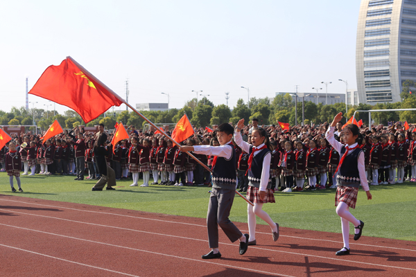 随着激昂的出旗曲奏响,鲜艳的大队旗在所有队员的面前经过,在高高的升旗台上迎风飘扬。