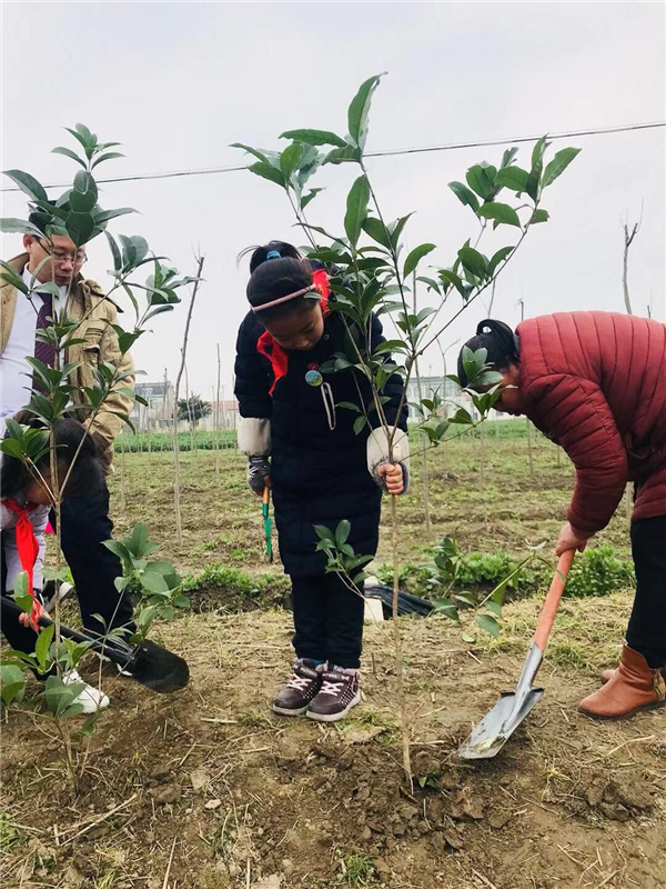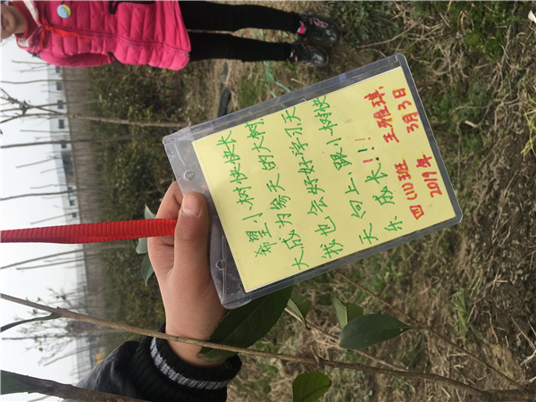 3月3日下午,四(11)向日葵中队的队员们,开展了一次意义非凡的植树活动。下午一点,老师、家长和孩子们一同扛着铁铲,提着小桶,哼着小曲儿驱车来到农场。活动中,大家互帮互助,场面好不热闹!从挖坑、搬运、扶苗到封土、浇水,一气呵成。汗水浸湿了衣裳但依然热情不减,北风吹红了脸依然干劲十足。植树结束后,孩子们还挂上亲手制作的许愿卡,写上自己的美好祝愿,希望有一天他们的梦想也能和他们亲手种下的小树苗一样,枝繁叶茂,开花结果。