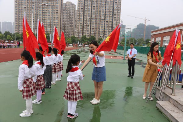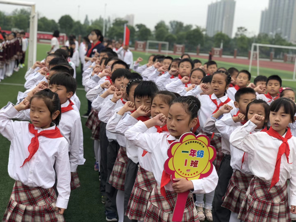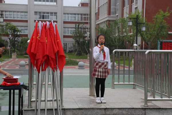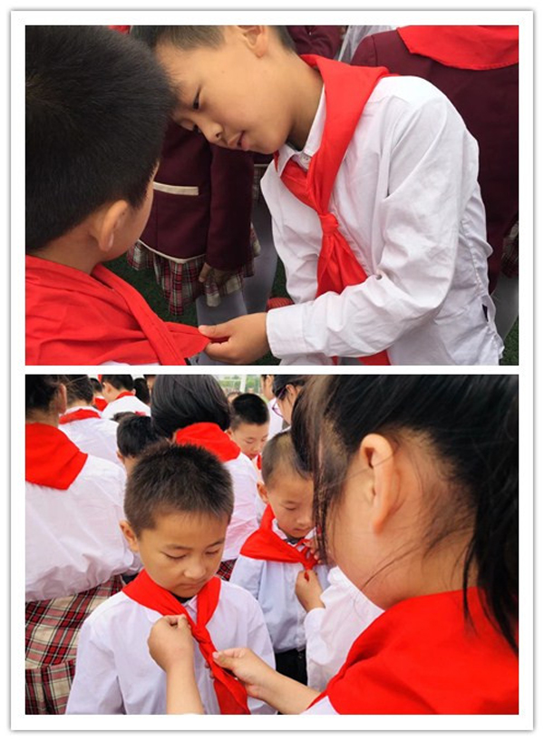 校长许卫兵对新入队的队员们表示祝贺并希望他们时刻牢记:牢记红领巾的颜色是跟国旗、党旗、队旗、团旗一样的红色,每个少先队员都成长在鲜艳的旗帜下,生活在祖国的怀抱里;牢记红领巾是中队旗上的一角,意味着每个队员都是中队里不可缺少的一员,每个队员都要通过自己的努力为中队、红领巾增光添彩;牢记入队的誓词“时刻准备着”,今天好好学习,明天报效祖国!