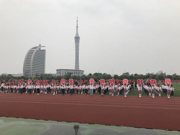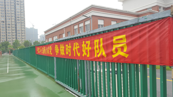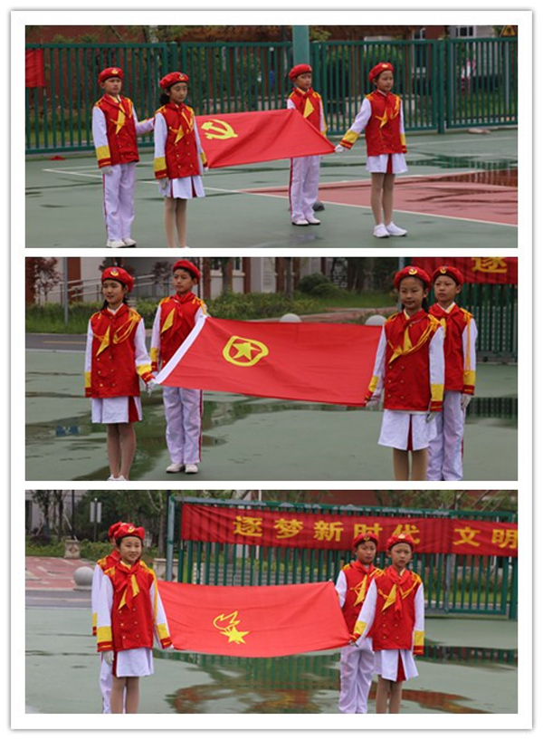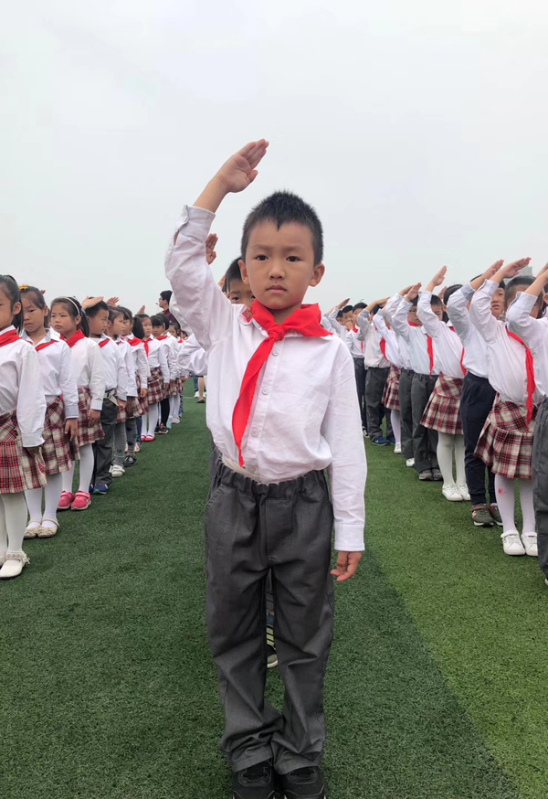 在许校长的感召下,在主持人的引领下,所有的少先队员一起高声喊出了我们的口号:“领巾飞扬心向党,争做时代好队员!”
