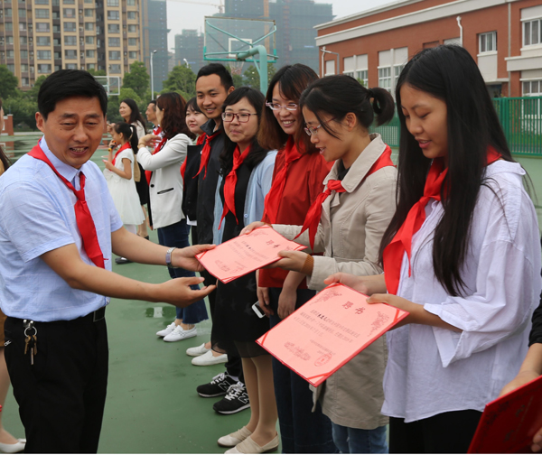 入队仪式上,许卫兵校长还亲自给正副辅导员颁发了聘书。真挚地期望辅导员老师们能一如既往地陪伴、呵护队员的健康成长。老师们第一次收到来自少先队的聘书,感到特别光荣和神圣。队员们看到老师也“领奖”了,一个个都咧开小嘴,笑得特别欢。