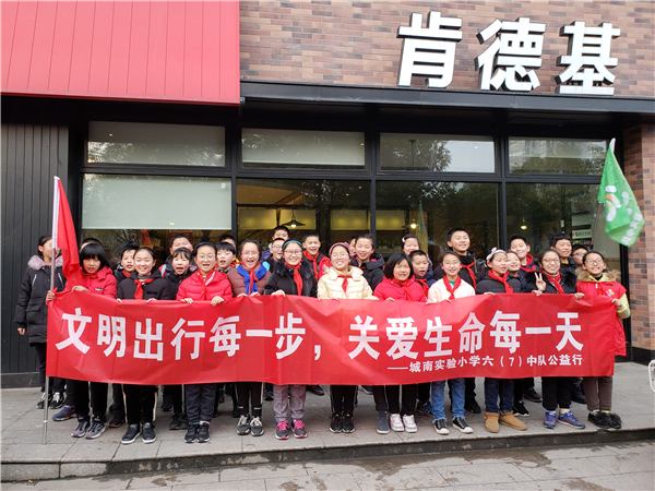 3月9日下午,六(7)中队队员齐聚中洋明珠城,进行了“文明出行每一步,关爱生命每一天”的交通安全宣传公益活动。