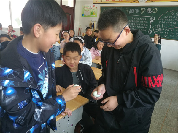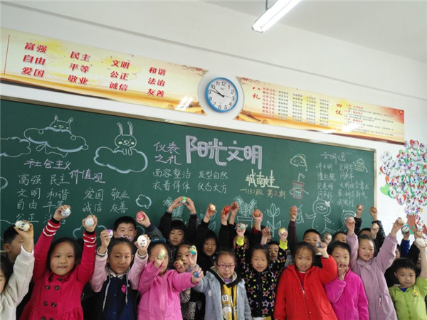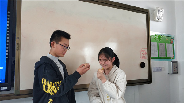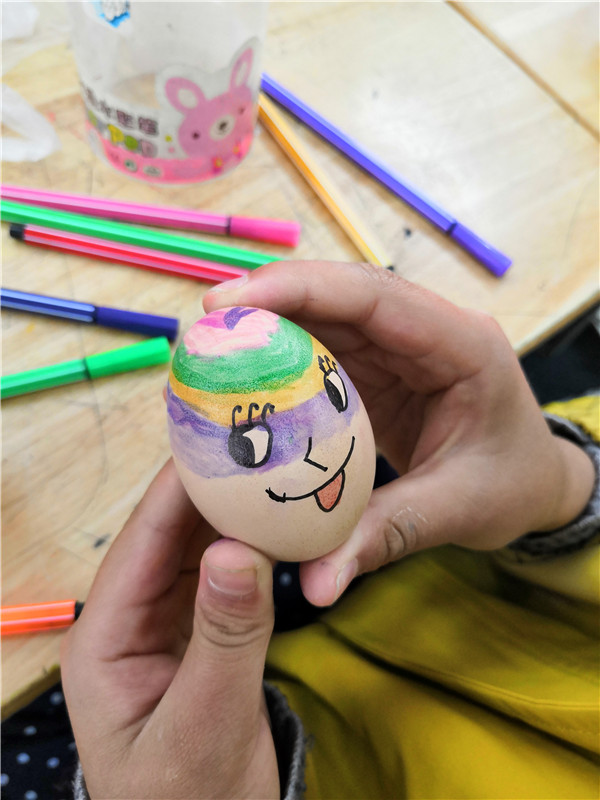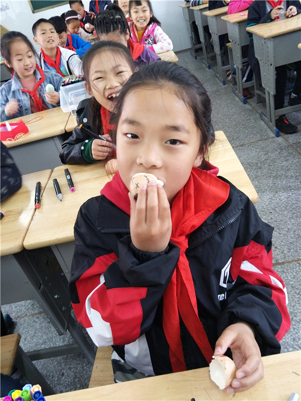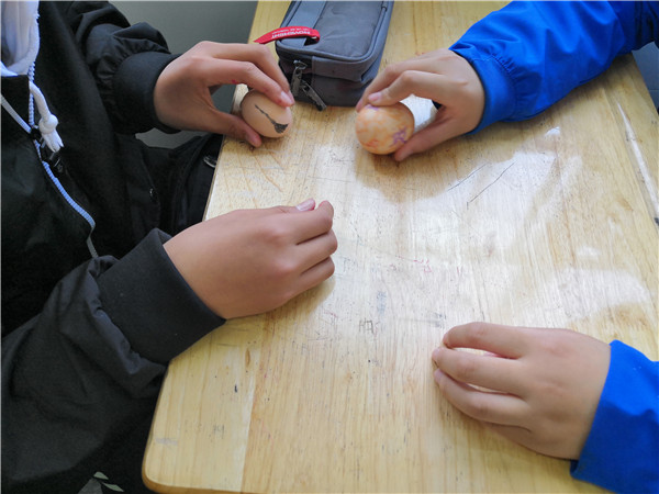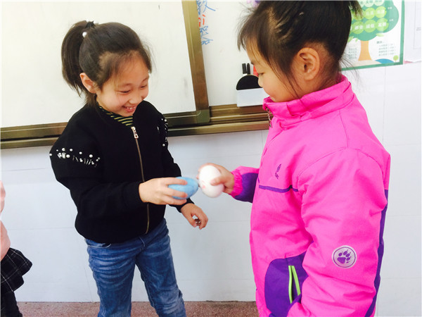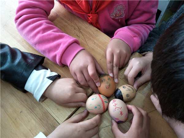 斗蛋,是最值得期待的。“大家准备好,蛋头对蛋头,蛋尾对蛋尾,预备,斗!”老师一声令下,同学们手持鸡蛋,捉对“厮杀”。我们忽而研究对策,忽而机智防守,忽而展开进攻,“最佳斗手”“最牛蛋王”“最靓彩蛋”脱颖而出,欢呼声、呐喊声、加油声此起彼伏。乐哉!
