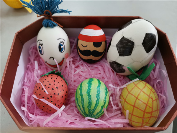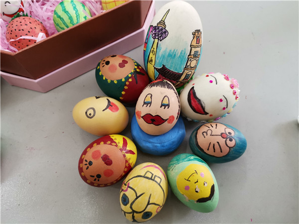 再看我们的蛋宝宝,今天可都是粉墨登场,这些都是我们的杰作!彩笔一挥,可爱的机器猫,萌萌的小姑娘,美丽的风景,蛋宝宝的妆容巧夺天工;也有特别加料的,橡皮泥、彩纸、泡沫等,让蛋宝宝神气起来了,变成了调皮的小老鼠、滑稽的七品芝麻官、可爱的小白兔、诱人的草莓……妙哉!趣哉!