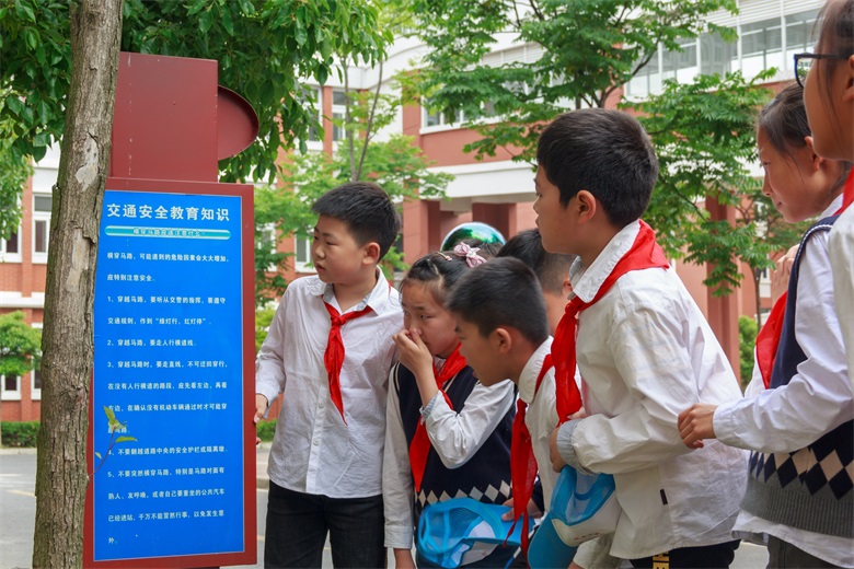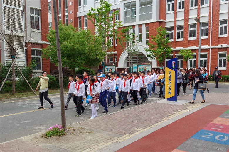 5月19日下午,城南实验小学四(6)班的师生和家长们聚集在校园内“交通安全示范路”,辨认交通标识,学习交通法规,倡导文明交通行为。