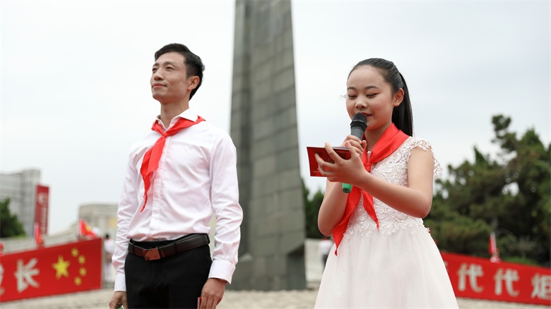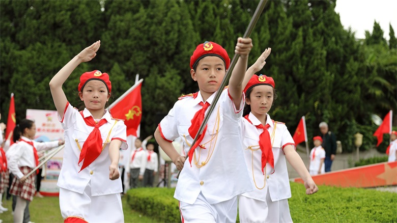 伴着雄壮的出旗曲,一面鲜艳的队旗从台前走过,入队仪式正式开始。在嘹亮的少先队队歌中,党旗、国旗、团旗、队旗四面红色的旗帜徐徐传递,“红色旗帜,代代相传”的口号响彻七战七捷上空。