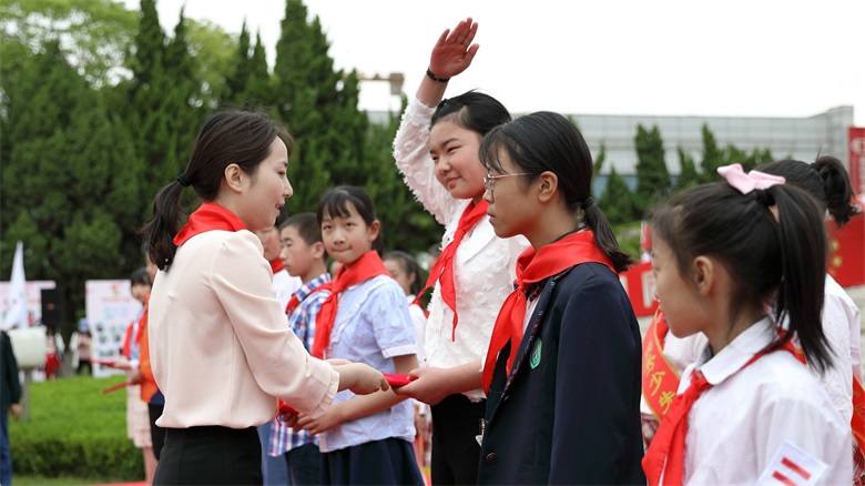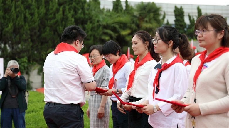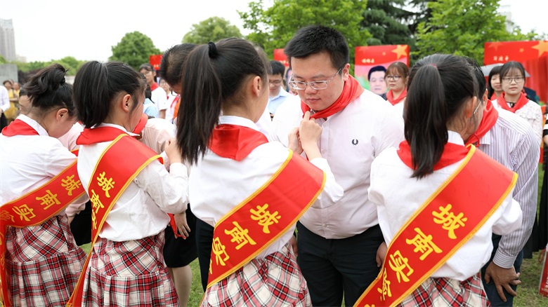 共青团南通市委书记、南通市青联主席王鸣昊,南通市教育局副局长、党组成员、市委教育工委委员、市少工委主任金海清,中共海安市委常委、组织部部长、统战部部长奚荣华,海安市人民政府副市长彭晓红,共青团南通市委党组成员、学少部长、市少工委主任周滢,各县市区团委分管领导、学少部长、少先队总辅导员,海安市教育体育局、共青团海安市委、海安市人武部、海安市城南实验小学相关领导以及三、五年级师生代表共同参加了本次活动,一同见证这一庄严的时刻。奚荣华部长和王鸣昊书记给少先队员们提出了殷切的希望。
