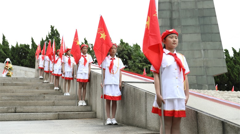 幸福的生活来自烈士们的浴血奋战,鲜红的队旗由革命先烈的鲜血染成。为表达继承先烈遗志的决心,少先队员代表向苏中七战七捷纪念碑敬献花篮。