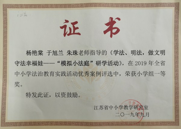 近日,由我校杨艳棠等老师设计的法治教育实践活动案例《学法、明法,做文明守法幸福娃——“模拟小法庭”研学活动》参加省中小学法治教育实践活动优秀案例评选获小学组一等奖。