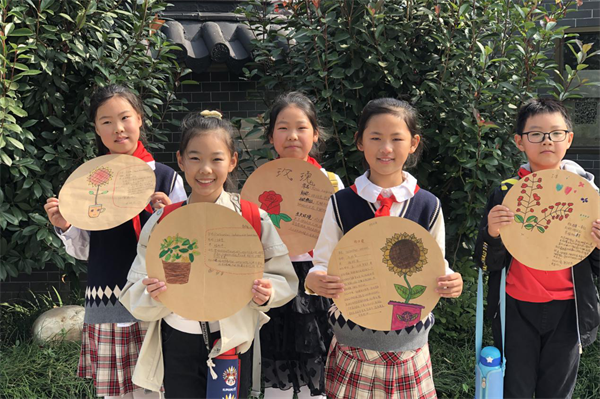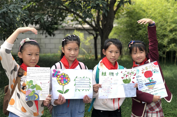 孩子们跟着老师和家长志愿者们且行且赏,东校区不少老师纷纷担起了义务讲解员,孩子们边听边记。西校区四、五年级的孩子们互相介绍着自己认识的植物,有的还把自己制作的植物卡片随身携带着!