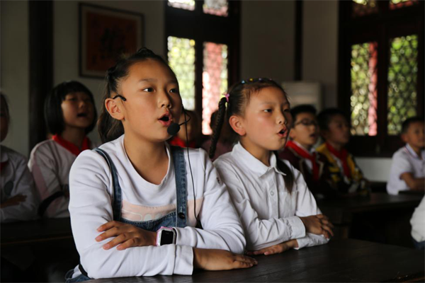 东校区孩子们的海安花鼓在水榭歌台流淌出文明传承的信念;竹笛悠扬和着动人的葫芦丝奏出对祖国的眷恋……