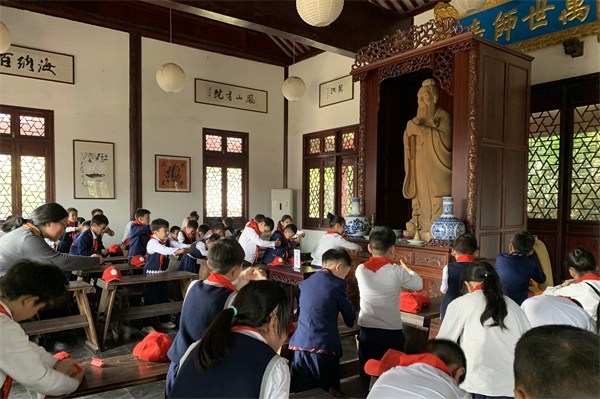 进入书院后,大家忍不住停下脚步,瞻仰孔子塑像。据说,这尊塑像是由一棵五百年的香樟树整树雕刻而成!习拜孔礼之后,大家来到“教室”里,齐声诵读。