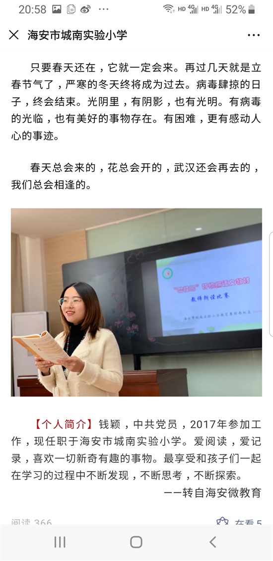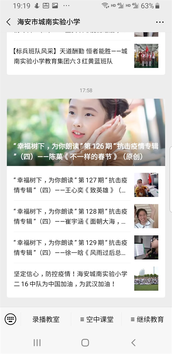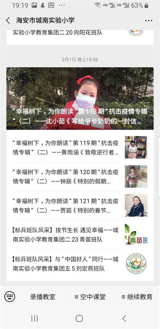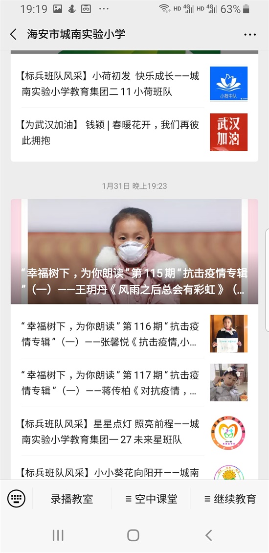 疫情发生后,海安市城南实验小学教育集团的全体师生、家长响应国家号召,思想上高度重视、行动上全力支持,积极参与疫情的防控。1月23日,二(7)中队的吴小琴老师和队员代表自编了正确佩戴口罩的儿歌:铝条要朝上,条纹要朝下,绳子挂耳边,下巴要包好,铝条贴鼻梁。他们将儿歌录制成小视频,老师们通过班级群、微信朋友圈等方式广泛转发,传播正确佩戴口罩的方法,为疫情的防控做出了城南人应有的贡献。