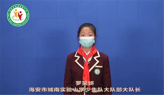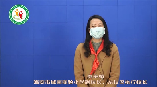 海安市城南实验小学副校长、东校区执行校长秦美娟通过屏幕带来题为《抗击疫情 收获成长》的国旗下讲话。