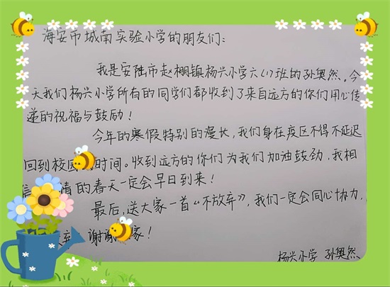 2月26日,海安市城南实验小学向湖北的两所“手拉手”友好学校——孝感安陆市赵棚镇杨兴小学、黄石市阳新县浮屠镇进中完全小学分别送去了学校老师和队员的关心和牵挂,下午便收到了杨兴小学的回信。文字当中充满着浓浓的温情。两地相隔千里,但是我们心手相牵,幸福共建。