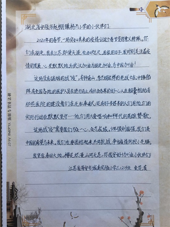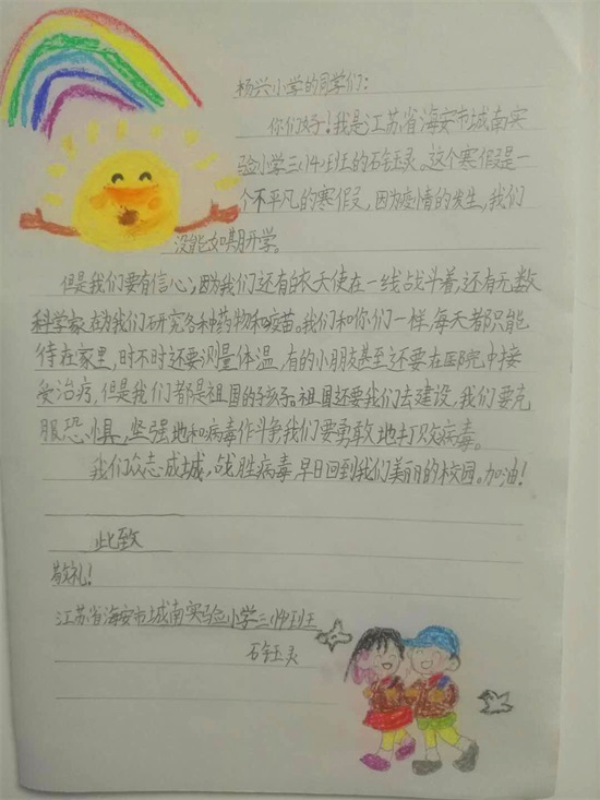 紧接着,我们收到来自城南实验小学三(14)班石钰灵小朋友和三(2)班金范溪小朋友写给杨兴小学的同学们的一封信!书信中,我们约定“众志成城战胜病毒 早日回到我们美丽的校园”!“我们坚信,春回大地,樱花烂漫,山河无恙,大家安好!”2020年的寒假,一场突如其来的疫情打乱所有人的计划与生活的节奏!江苏、重庆、黑龙江人民伸出一双双温暖的手牵起安陆人民一起共同奋战!