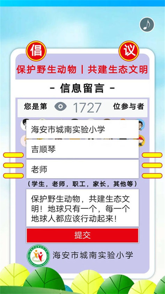 倡议发出后,立即得到了学生、家长和老师的积极响应,仅用1小时20分,参与活动的人数就已破万!广大师生家长不仅自己参与活动,还通过微信转发等方式进行扩散,让更多的人成为生态文明建设的光荣使者。截止9日16时48分,参与该活动的人数已经达到21638人。