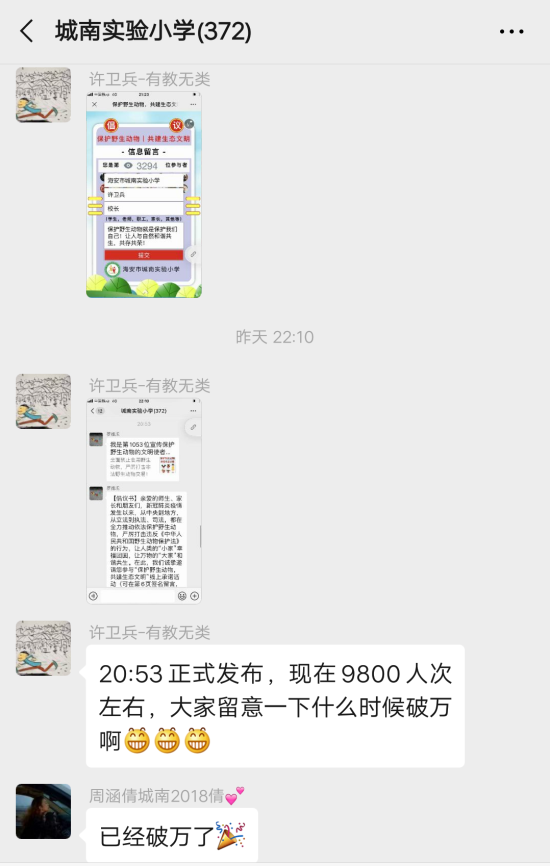江苏省城南实验小学教育集团总校长、少工委主任许卫兵在留言中写道:“保护野生动物就是保护我们自己!让人与自然共生,共存共荣。”二(10)班的学生温馨在留言中写道:“与动物做好朋友,共同生活在同一个大自然下。”疫情中与我们学校结为友好学校的湖北省黄石市进中完全小学的师生也参与了活动,秦蕊同学在留言中写道:“保护野生动物,共建和谐家园!共同抗击新型冠状病毒!中国加油!湖北加油!白衣天使加油!”江苏海安市城南实验小学五(5)班的班主任吉顺琴在留言中写道:“保护野生动物,共建生态文明!地球只有一个,每一个地球人都应该行动起来。”西校区的曹淑萍老师在留言中写道:“野生动物是人类的朋友,共享环境资源,维护生态平衡。”东校区的家长高传梅在留言中写道:“与自然和谐共生存,坚决拒绝野味!”