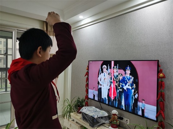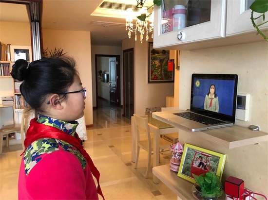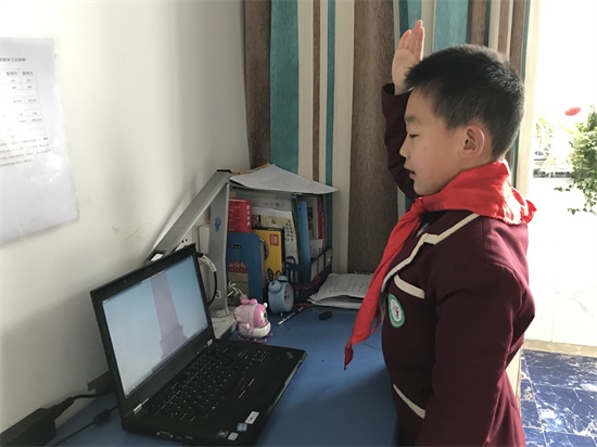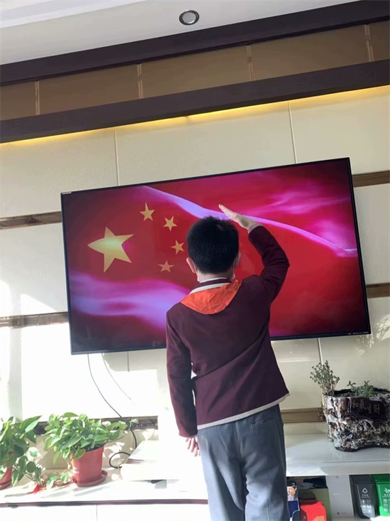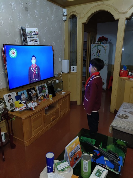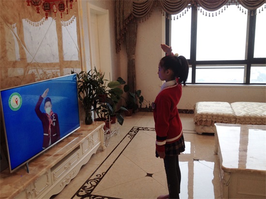 这次升旗仪式由本部校区少先队大队部旗手万季主持。“请全体立正!升国旗!唱国歌!敬礼!”响亮有力的声音透过屏幕传来,队员们立即屏气凝神,小手高高举过头顶,凝视着五星红旗,神情肃穆庄重。这场抗击新型冠状病毒肺炎的人民战、阻击战让队员们对祖国有了更深的依恋和热爱。