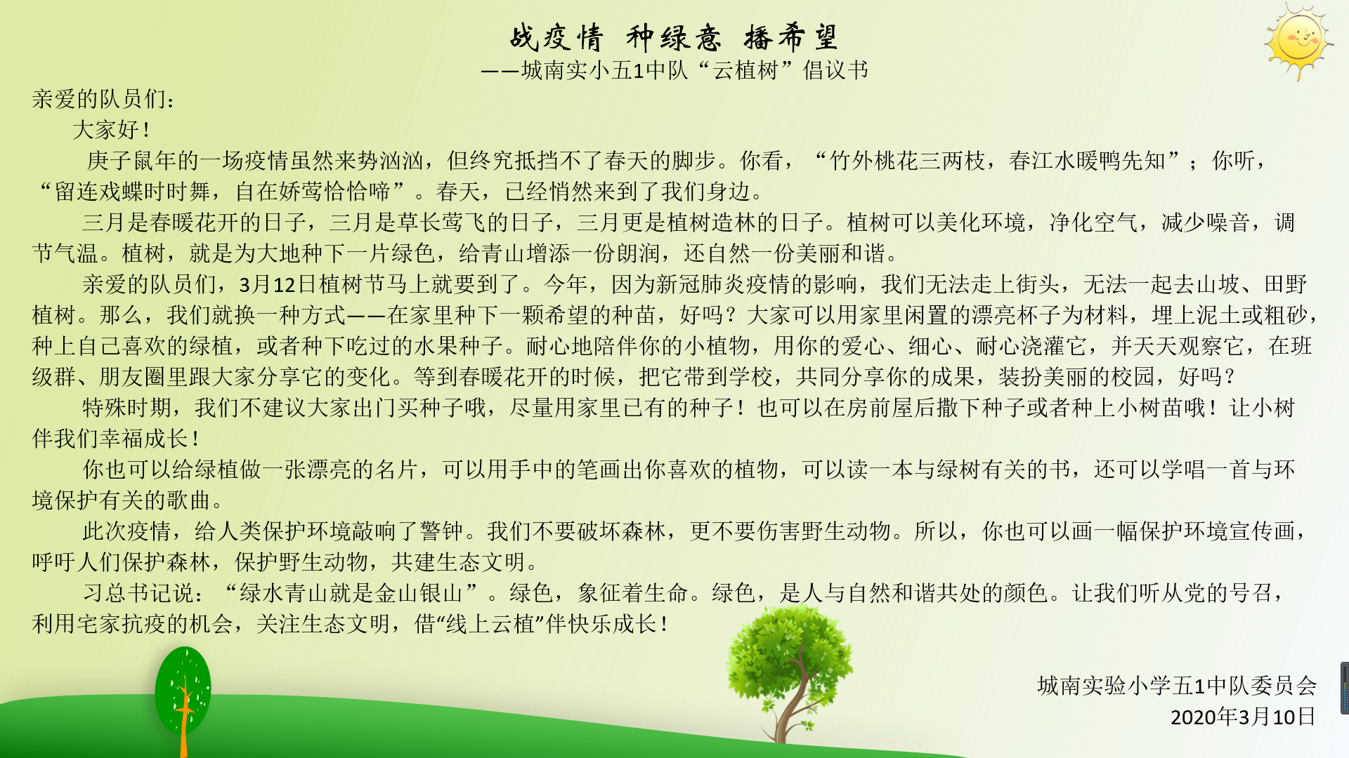 今年因为新冠肺炎疫情的影响,我们只能宅在家中。但是疫情怎能阻止万物生长?宅家也可以花样植树。在大家的精心筹划下,城南实验小学五1中队委员会向全中队的队员发出倡议,号召大家同战疫情,种下绿意,播撒希望,线上花样植树,共建生态文明。