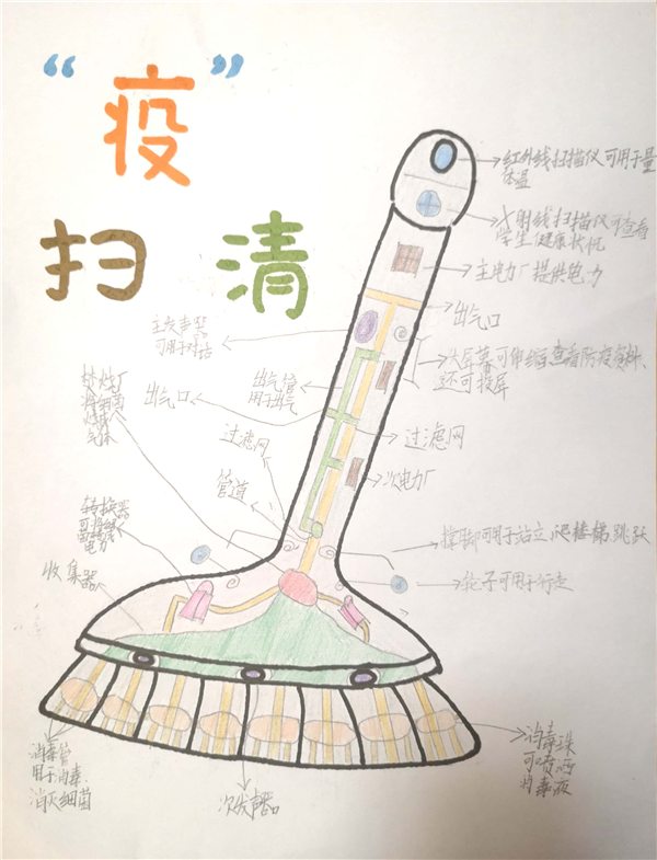 魏子集设计说明:它的功能可多了:清扫、消毒、净化空气、查看体温……我来说说净化空气功能吧!他一边打扫卫生一边将细菌和灰尘收集起来,进入一个小型焚烧厂。“呼——”真是“烈火焚烧若等闲”啊!接着将焚烧完的空气和灰尘进入第一道过滤层。哇!灰尘一下子被过滤掉了。可是空气呢?还得进入第二、三、四道过滤层,最终从出气口出来的都是清新的空气!怎么样?“疫”扫清是不是很厉害?