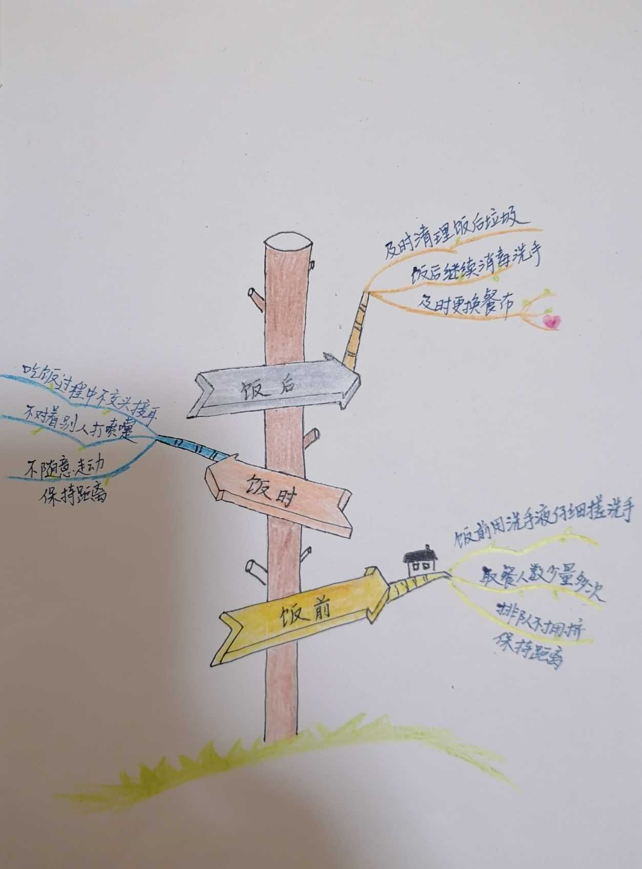 队员们通过向书本、权威发布、身边的专家等多种途径的学习,探究了“文明就餐” “健康就餐”“防疫”等话题,并把自己的收获绘制成了在校就餐防控疫情注意点思维导图。他们还通过云上讨论与展示的形式,交流了自己的收获与建议。