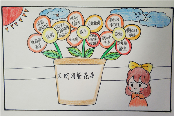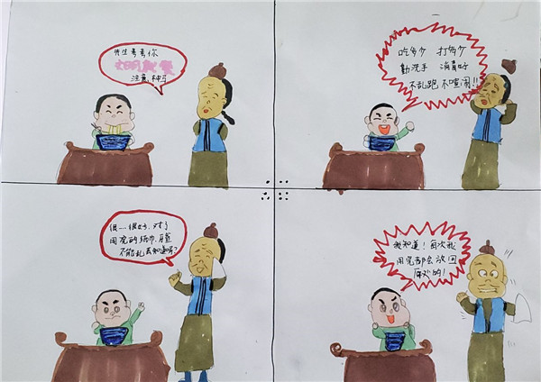 吴宇航、朱杭涵和仲司承还绘制了“文明就餐”连环画,通过喜闻乐见的方式让队员们牢记文明就餐、健康就餐注意点,并能积极行动起来。