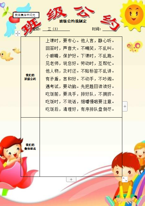 为了在日常学习生活中,能更好地提醒、督促自己,在讨论完毕后,队员们还把讨论结果进行了归纳与提炼,形成了班级就餐公约。