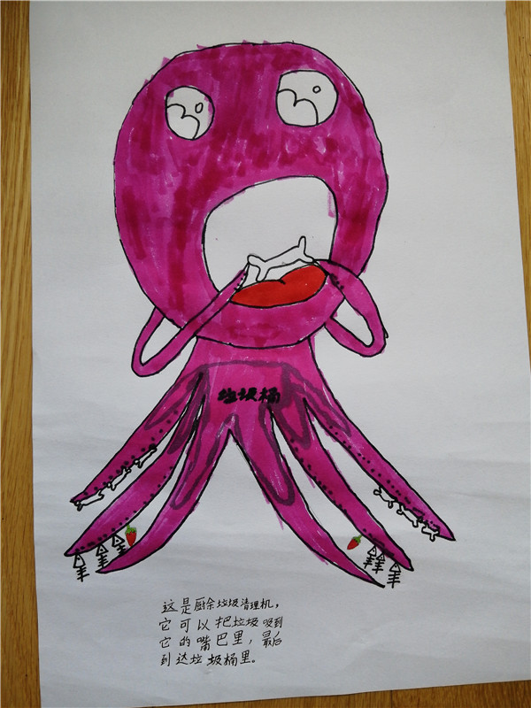 我是一只特别的章鱼,脚掌上的吸盘,吸附在墙上,不占地方。然后通过嘴把垃圾送入体内的垃圾桶里,帮忙处理消化,这样可以第一时间分类处理垃圾,阻断细菌的滋生,还能给食堂的工人们省去许多麻烦呢。