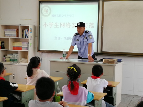 6月5日,海安市城南实验小学东校区五14中队来了一位特殊的老师--海安市城东派出所的朱伟民警官,他给同学们上了一节别开生面的班会课,主题便是“小学生网络安全如何防范”。