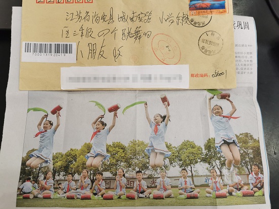 2020年6月22日,城南实小东校区收到了一封来自邯郸的信,信封上面没有具体的收信人,只写着“四个跳舞的小朋友收”。写给谁的?带着疑惑打开它,竟然是一张从报纸上剪下的照片——城南实小东校区孩子跳花鼓刊登在人民日报上的照片。这封信来自一名抗美援朝老兵,九十四岁的黄先明。黄老先生曾作为中国人民抗美援朝志愿军代表,到苏北宣传中朝人民军队抗击美帝主义的胜利消息和故事。报纸上“海安”这个词,勾起了他美好的回忆,情不自禁拿起笔给城南实小东校区四个跳花鼓的孩子写信。
