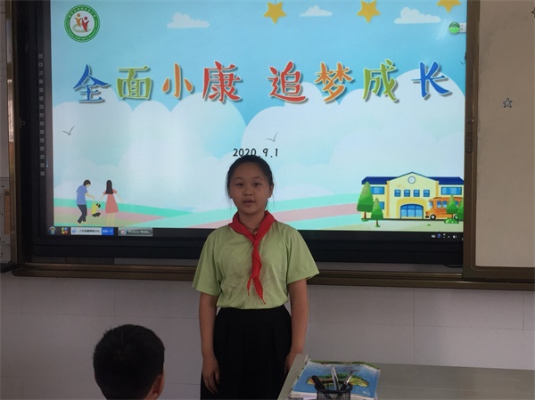 为了让队员们更好地理解什么是“小康生活”,许平平老师借助动画视频给大家讲解了小康生活的含义,通过十八洞村脱贫致富的故事,引领队员们体会到党中央的坚强领导让人民的生活越来越好。队员王心奕与大家分享了亲历防疫抗疫,感受到党和政府始终把人民群众生命安全放在第一位的大国情怀以及制度的优越。五年级的四名同学通过诙谐有趣的《海安变化三句半》,带领队员们感受海安改革开放四十年来各行各业翻天覆地的变化。