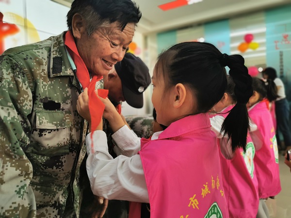 小队员们给老兵爷爷系红领巾,行队礼,唱队歌。