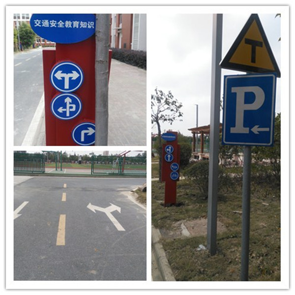 城南实小在二期工程建设之际,对校园环境进行整体设计、提档升级,专门划出一块区域设置交通安全情景区,对学生进行交通安全教育。交通安全情景区按照真实道路情况,在道路上画了单黄线、转向箭头、人行道等,在路边安装了交通指示牌,同时将一些交通常识做成造型优美的装饰物安置在道路两边,由学生参观学习。