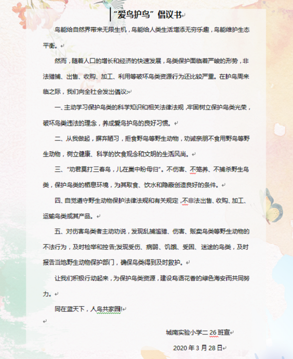 鸟是大自然的精灵,有了鸟儿,才有鸟语花香:有了鸟儿,蓝天才更美丽。在第39个“爱鸟周”来临之际,为了激发更多的小伙伴爱护鸟类、热爱大自然、保护生态环境的意识,带动更多的人加入爱鸟、护鸟的行动中,3月20日,城南实小西校区低年级的孩子发出了这样的倡议: