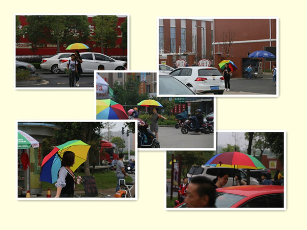 而今,一把把彩虹伞,成了城南实小教师护学岗、家长护学岗志愿者们的又一个标志。它醒目,带给家长和孩子们安全感;它宽大,足以为老师和孩子留下一块没有风雨的天地。一把把醒目的彩虹伞,成了高庄路上又一道靓丽的风景。