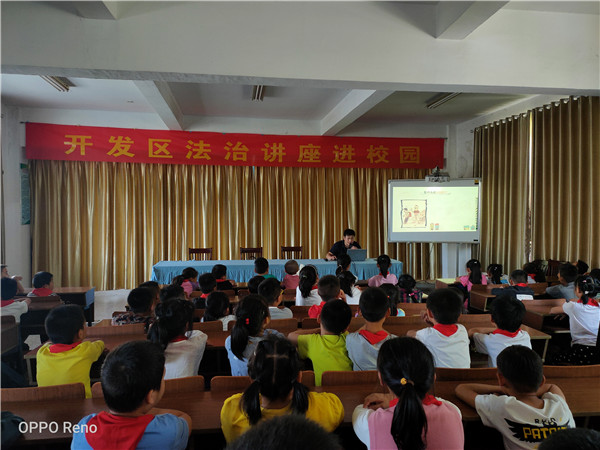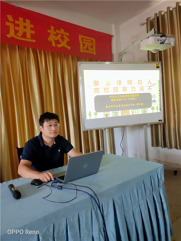 为加强法制宣传教育和思想道德建设,增强未成年人自我保护和防范、抵御不法侵害的能力,9月20日下午,海安城南实验小学东校区邀请海安市司法局开发区司法所韩李康助理为二年级全体师生举行了一场题为“做法律明白人 向校园暴力说不”的专题讲座。