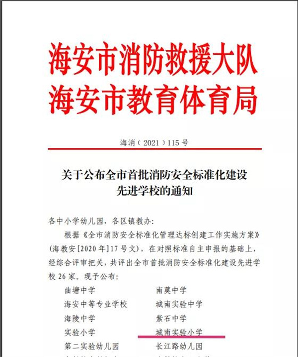 10月13日,从海安市教育体育局传来喜讯,城南实验小学荣获全市首批“消防安全标准化建设先进学校”荣誉称号。此次评比活动是由海安市消防救援大队和海安市教育体育局联合组织的,全市26所学校为首批消防安全标准化建设先进学校。