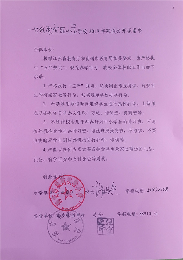 海安城南实验小学2019年寒假公开承诺书