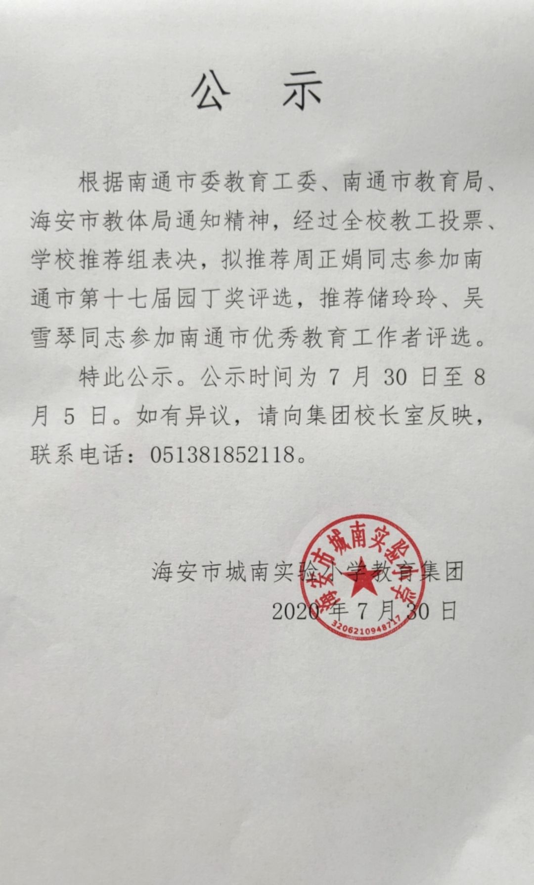南通市园丁奖、优秀教育工作者校级推荐公示